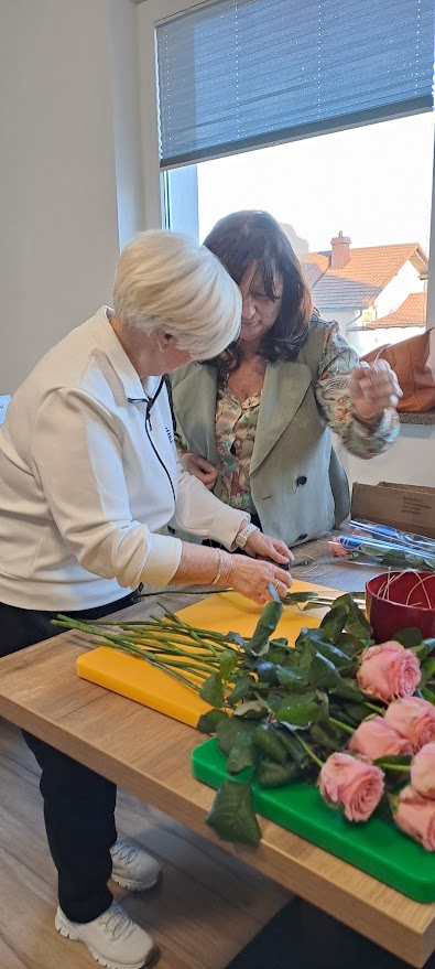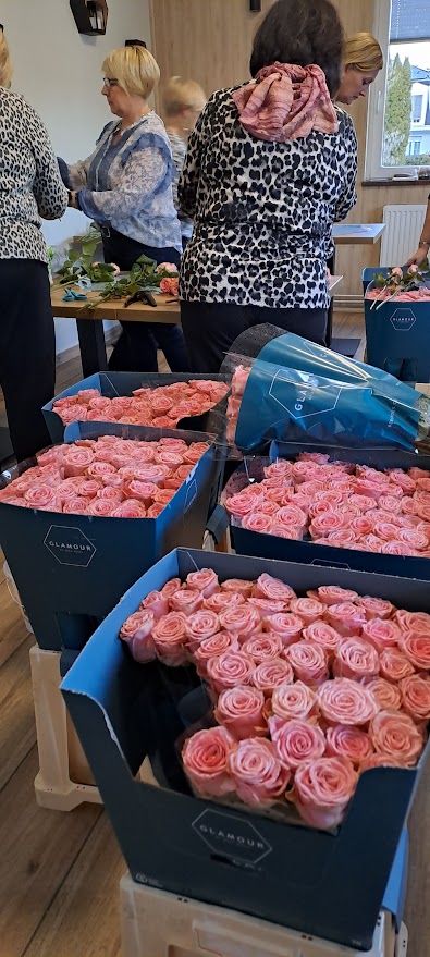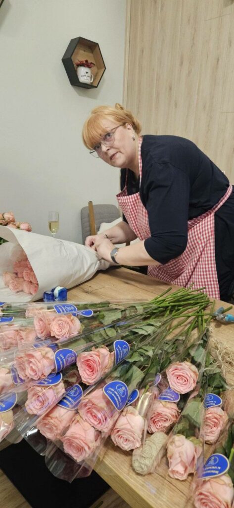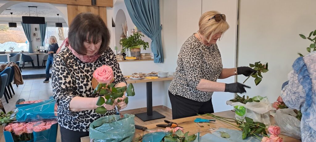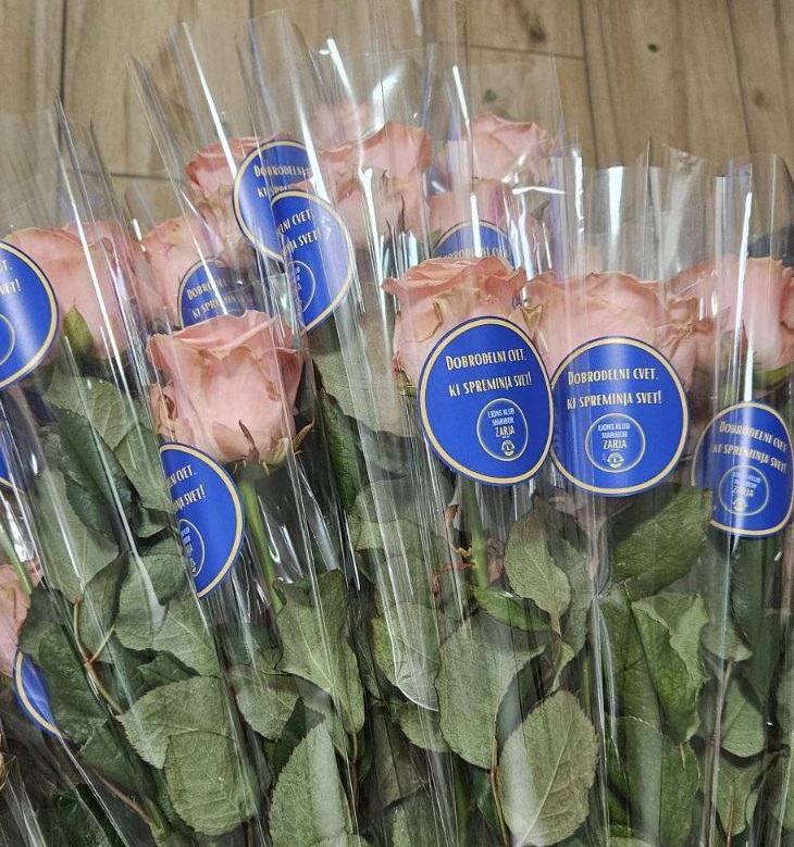 Dan pred razvozom cvetlic smo prostovoljke v čudovitem druženju pri naši tajnici Darji očistile odvečnih listov in trnov 360 prekrasnih vrtnic. Ustrezno aranžirane in označene z našim lions znakom smo jih naslednji dan dostavile na 28 različnih lokacij, 16 v Mariboru, ostalo pa v Hoče, Starše, Kamnico, Lenart, Limbuš, Lovrenc, Ruše, Sladki vrh in Šentilj. Povsod so bile zaposlene prijetno presenečene in vesele izkazane pozornosti.